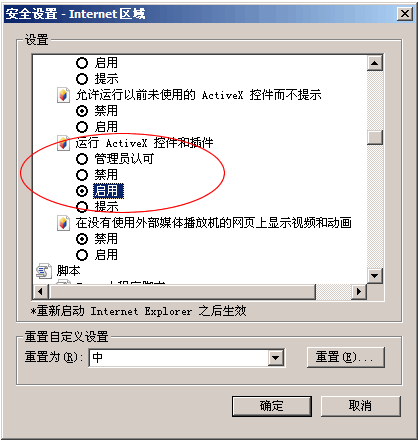 如果您不愿意将浏览器的安全级别下调,建议您修改部分设置,将“运行ActiveX 控件和插件”修改为启用,,以下为图解