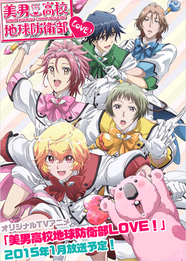 美男高校地球防卫部LOVE是一部原创动画,讲述的是五位帅哥高中生与那只粉色未知生物的故事……美男高校地球防卫部LOVE将于2015年1月开播。